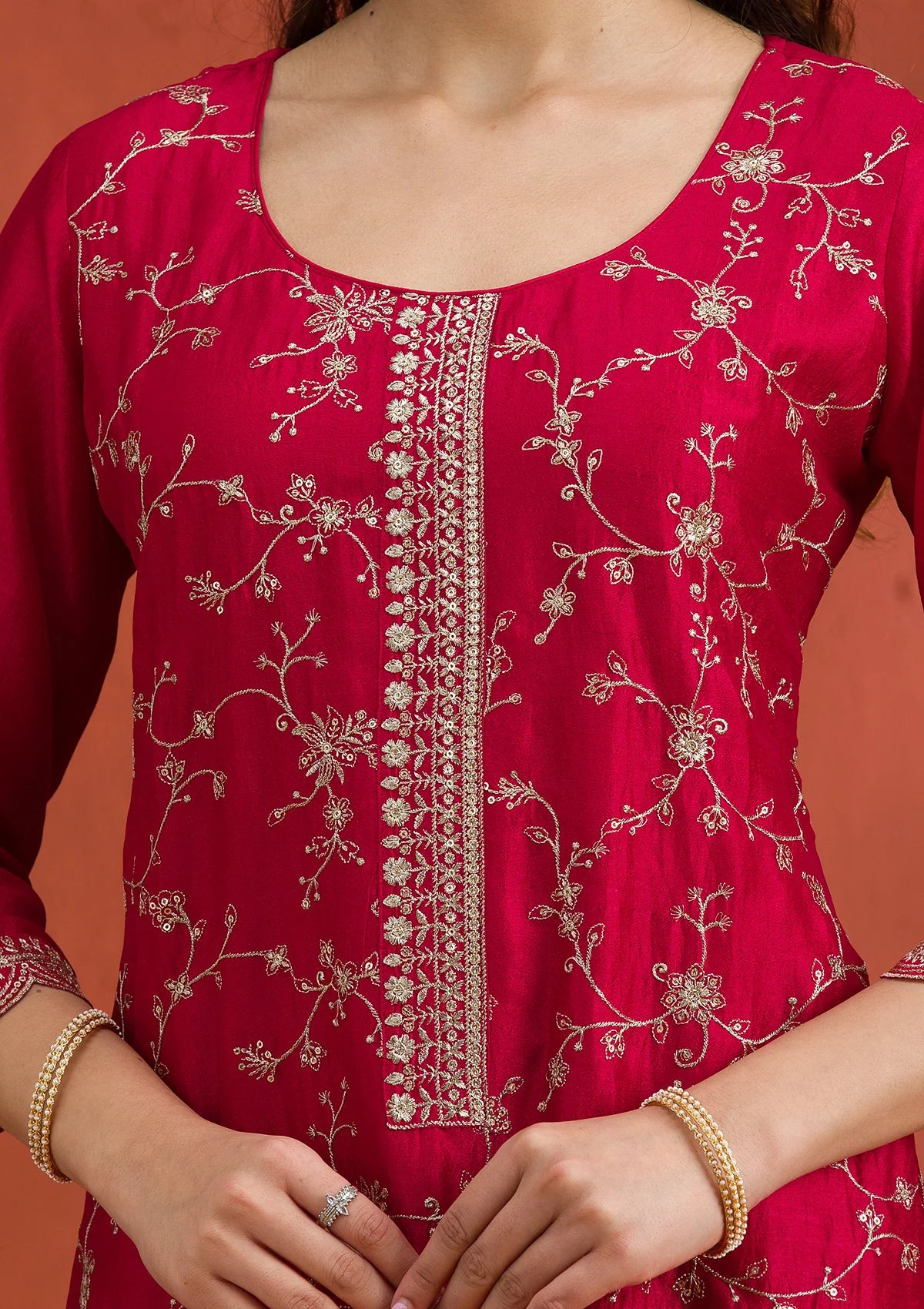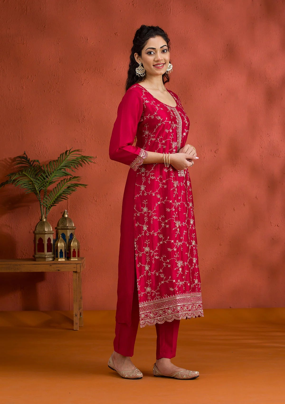 Elegant Rani Pink Threadwork Raw Silk Readymade Salwar Suit for Women Perfect for Festive Wear