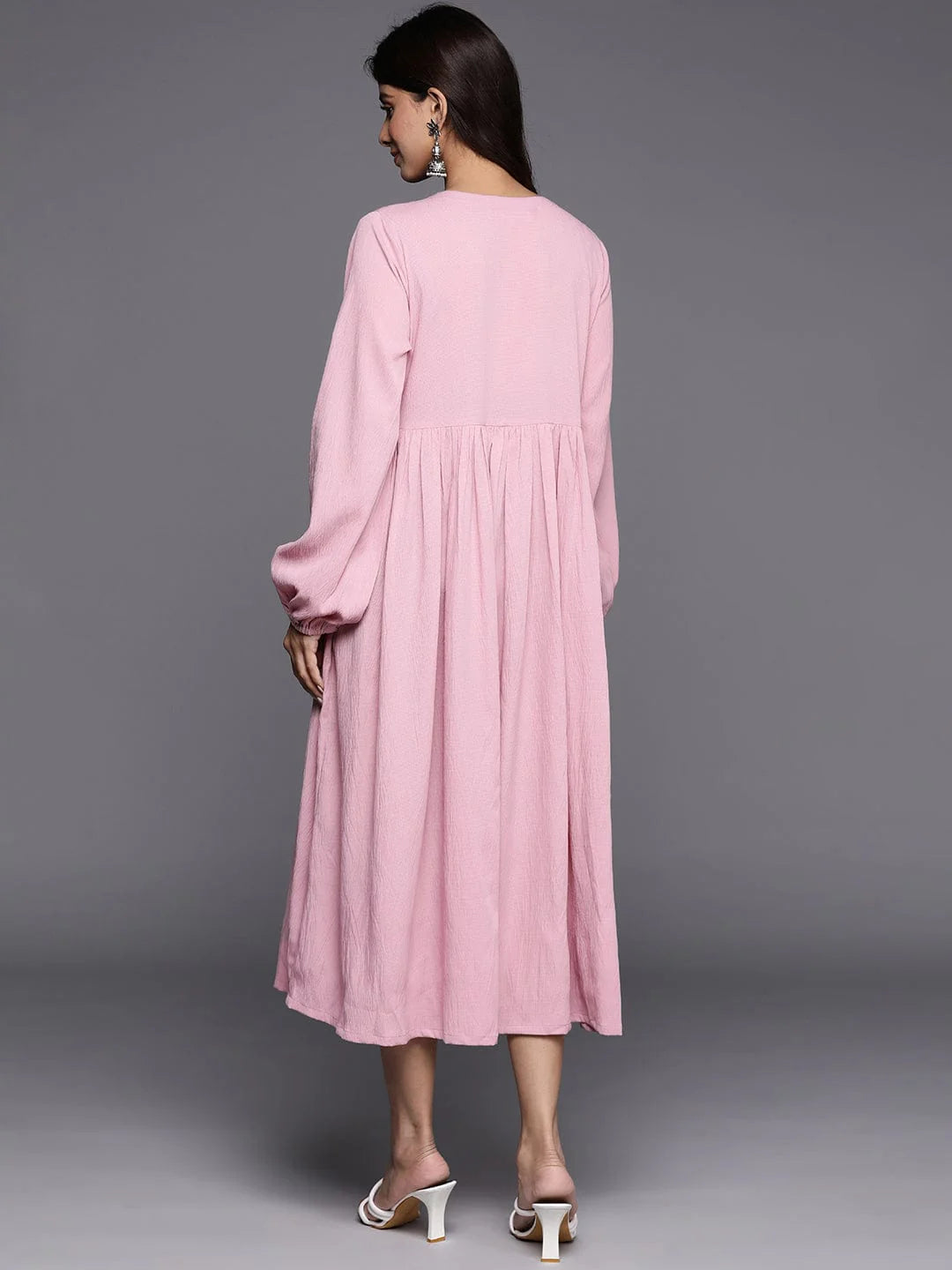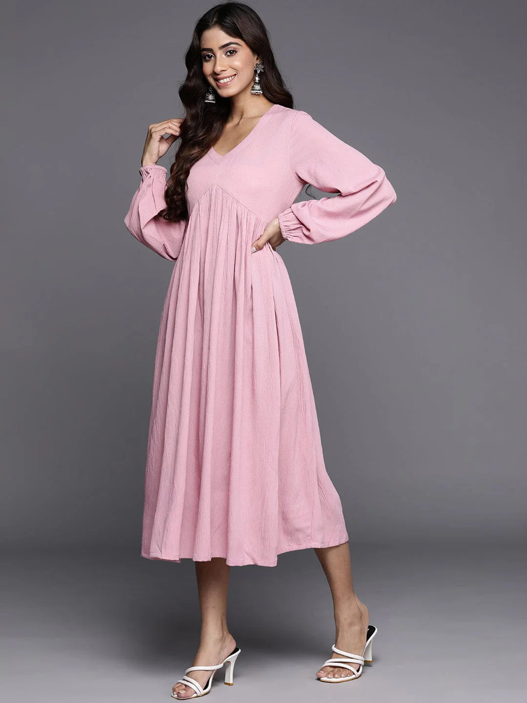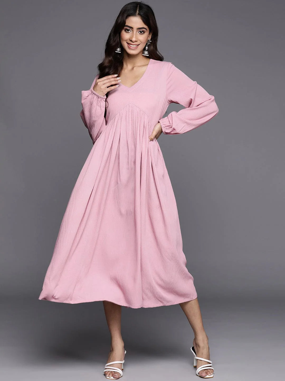 The elegant women’s pink V neck bishop sleeve calf-length A-line dress is designed to combine femininity, style, and comfort in one versatile piece. Crafted from lightweight, breathable fabric, this dress ensures all-day ease while maintaining a polished appearance. Its soft texture allows for effortless movement, making it ideal for casual outings, office wear, or semi-formal occasions. The flowing material also enhances the overall drape, giving the dress a graceful and flattering silhouette.