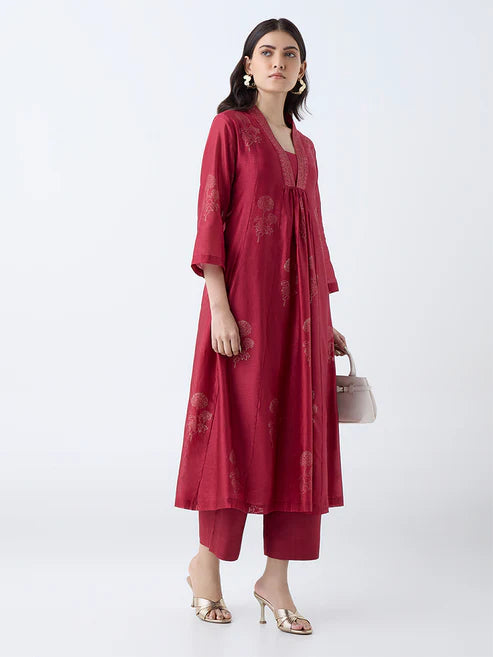 The kurta features a classic flared Anarkali design, offering a flattering fit that enhances the natural curves while allowing freedom of movement. The inner lining adds structure and modesty, ensuring a smooth, elegant drape that complements the flared outer layer. The floral motifs are thoughtfully placed across the fabric, creating a harmonious and visually appealing pattern that exudes sophistication and charm. The combination of vibrant red and delicate floral prints makes this kurta stand out, while its contemporary cut ensures versatility for various occasions.