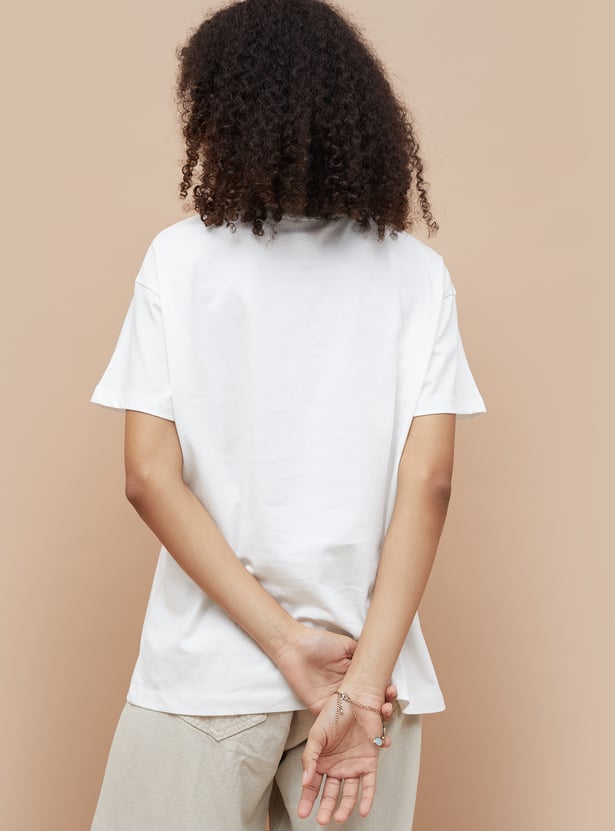 The classic round neckline and short sleeves contribute to the t-shirt’s timeless and versatile design. The round neck offers a comfortable fit while providing opportunities for accessorizing with necklaces, chains, or layered scarves. The sleeves and loose hemline complement the oversized cut, creating a balanced, relaxed silhouette that is both flattering and stylish. This t-shirt pairs effortlessly with a wide range of bottoms, including jeans, shorts, joggers, or skirts, making it a versatile option for casual streetwear and everyday ensembles.